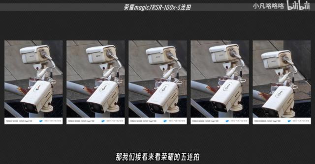 比如,2025 年 1 月,B 站 UP 主"小凡咯咯咯"在评测视频中,使用荣耀 Magic7 RSR 拉高到 100 倍变焦,前后五次拍摄同一个摄像头,结果五张照片中,摄像头接口的细节各不相同。