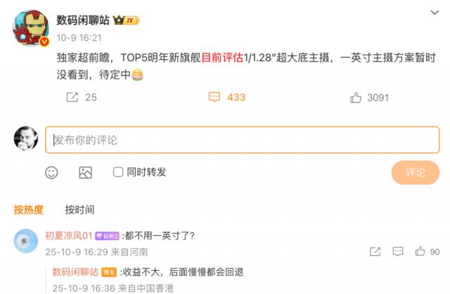 2025 年 10 月 9 日,数码博主"数码闲聊站"爆料称," TOP 5 明年新旗舰目前评估 1/1.28 英寸超大底主摄,一英寸主摄方案暂时没看到,待定中"。在评论区,"数码闲聊站"进一步表示,"一英寸收益不大,后面慢慢都会回退"。