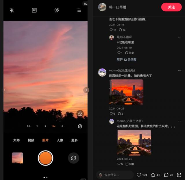 8 月 19 日,小红书网友"喝一口再睡"发帖称" OPPO 所见非所得",使用 OPPO Find X7 Ultra 拍摄晚霞时,取景框是真实的样子,结果按下快门后,照片却"浓妆艳抹",饱和度过高。
