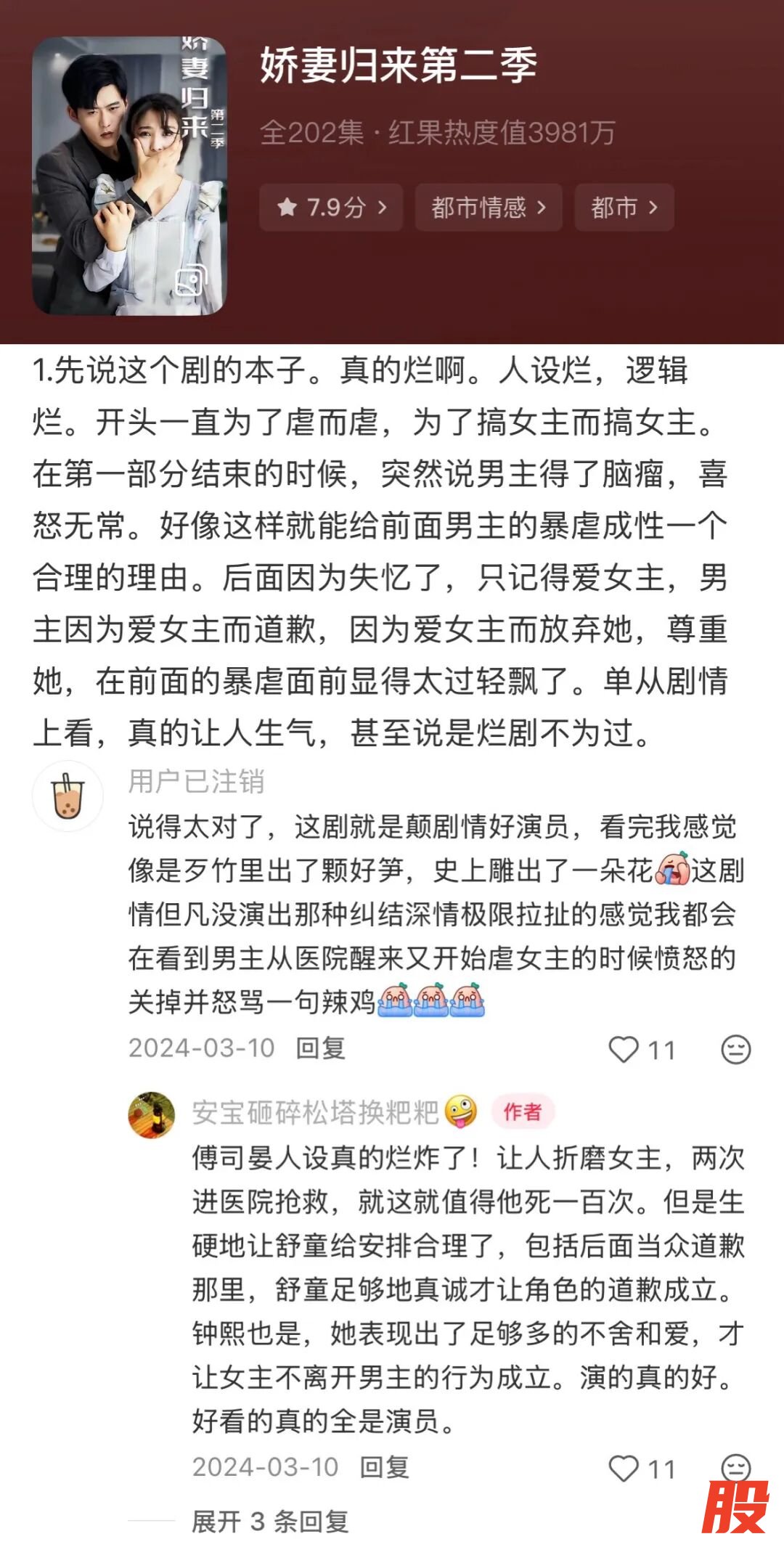 例如早期被尊称为“短剧界甄嬛传”的《娇妻归来》,200集的剧情,集虐女、失忆、追妻火葬场于一身,逻辑烂、人设烂,但在当时短剧圈子依旧是炙手可热。